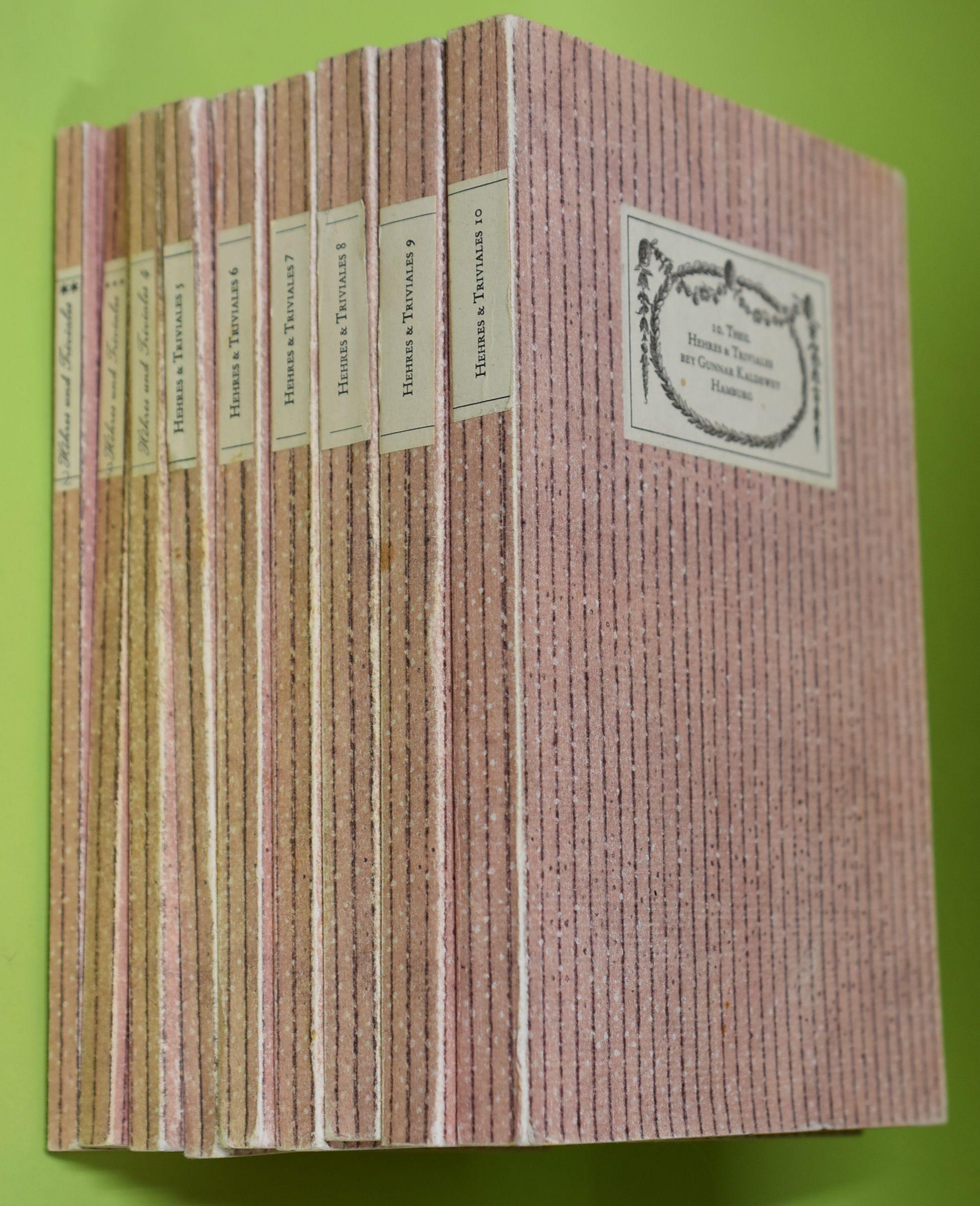 Zustand: Kanten berieben, wenig bestoßen, vereinzelt leicht fleckig. Frakturschrift. Namenseintrag und Annonationen kommen vor --- Inhalt: sehr aufwändig gestaltete Antiquariatskataloge mit etlichen Faksimile-Abbildungen, montierten Tafeln und Abbildungen, teilweise in Farbe oder ausklappbar. Hehres & Triviales 1.-10. Theil: 1 ist Katalog 3 von 1971 noch in kleinerem Format (21cm), Band 11-12: Literatur des 18. Jahrhunderts, Band 13-14 Deutsche Romantiker, Band 15-16: Literatur, Philosophie, Pädagogik usw. 18. u. frühes 19. Jahrhundert. jeweils durch mehrere Register gut erschlossen. Katalog 52 Marginalien zur deutschen Literatur und Politik und Katalog 54 Deutsche Romantiker WU1-9