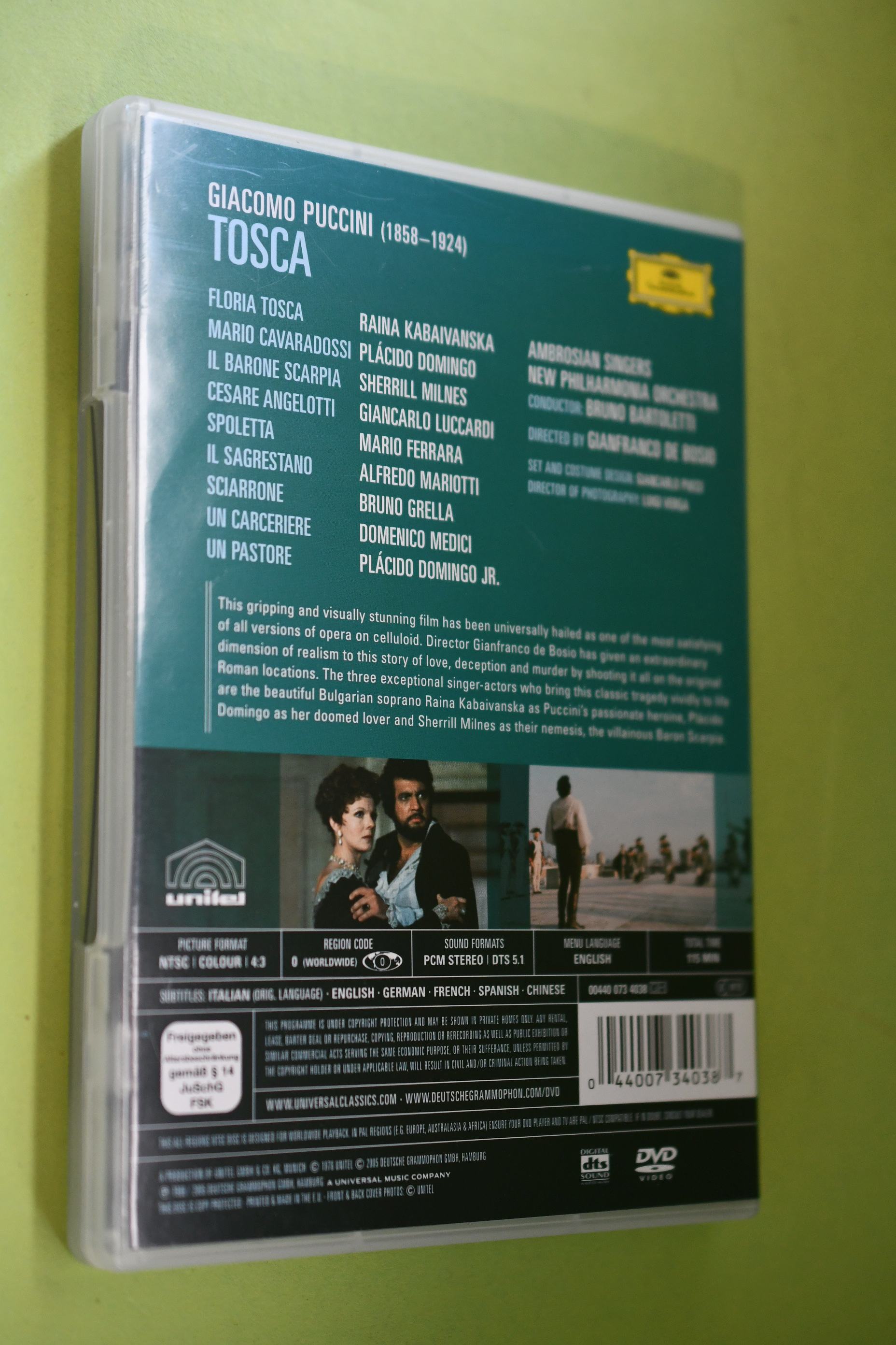 Zustand: DVD mit Beiheft in Jewelcase, sehr gut --- Inhalt: Aufnahme von 1976; Beiheft in englisch, deutsch, französisch. Tosca wird italienisch gesungen. DVD mit Untertiteln in Italienisch, Englisdch, Deutsch, Französisch, Spanisch und Chinesisch. Laufzeit 115 min., Bildformat 4:3, Menüsprache englisch. Tosca: Raina Kabaivanska, Cavaradossi: Placido Domingo, Scarpia: Sherrill Milnes, Angelotti: Giancarlo Luccardi..Dirigent Gianfranco de Bosio T3-6