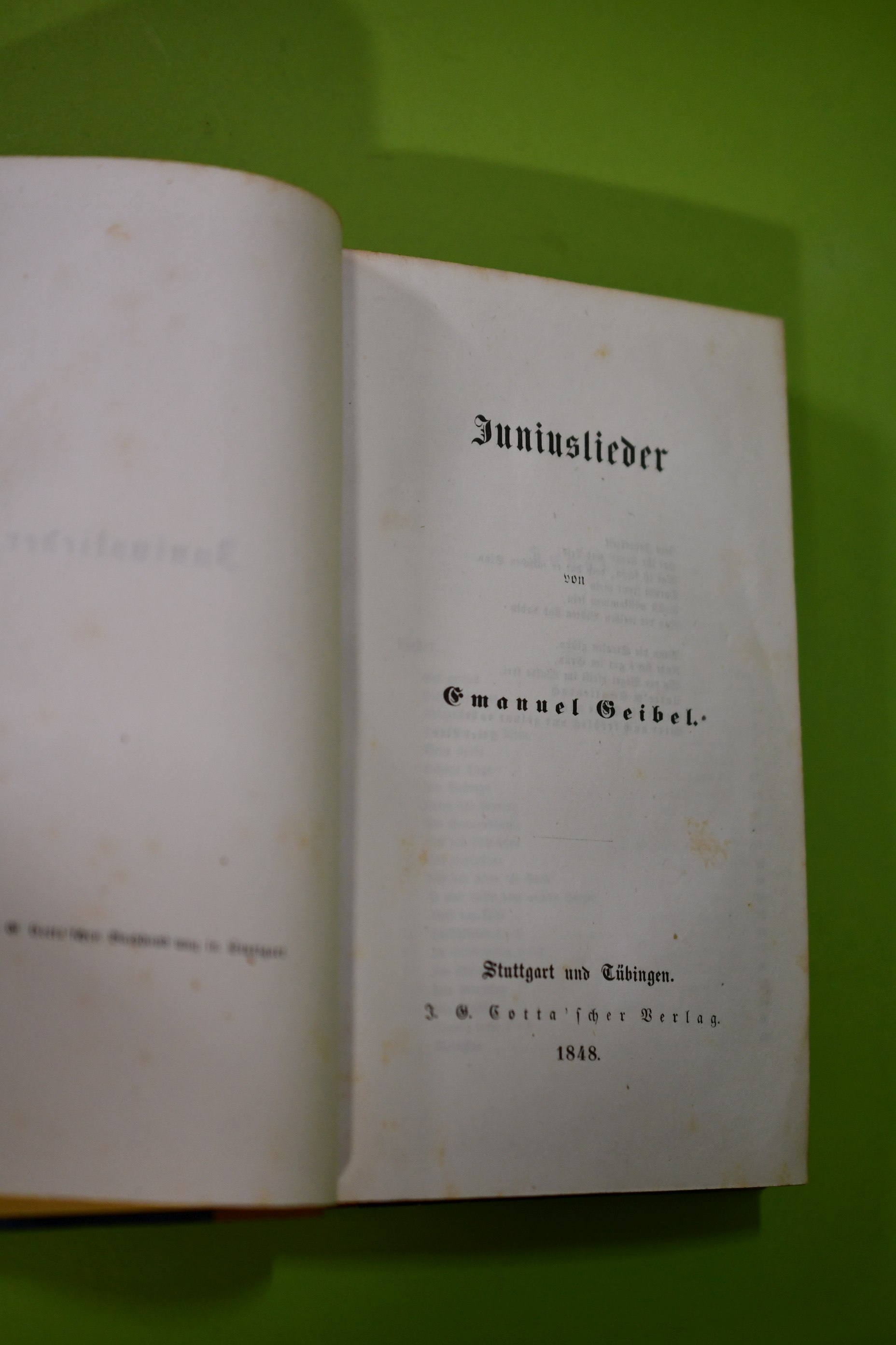 Zustand: goldgeprägter Halbledereinband der Zeit, Kanten berieben, gemusterter Schnitt, Papier hell, leicht wolkig fleckig, Frakturschrift --- Inhalt: Lieder, Vermischte Gedichte, Zeigedichte, Sonette, Gelegenheitsgedichte/Sprüche/Scherze, Der Troubadour I- VIII, Balladen vom Pagen und der Königstochter, Morgenländischer Mythus, König Sigurds Brautfahrt, Buch der Betrachtung HZ3-2